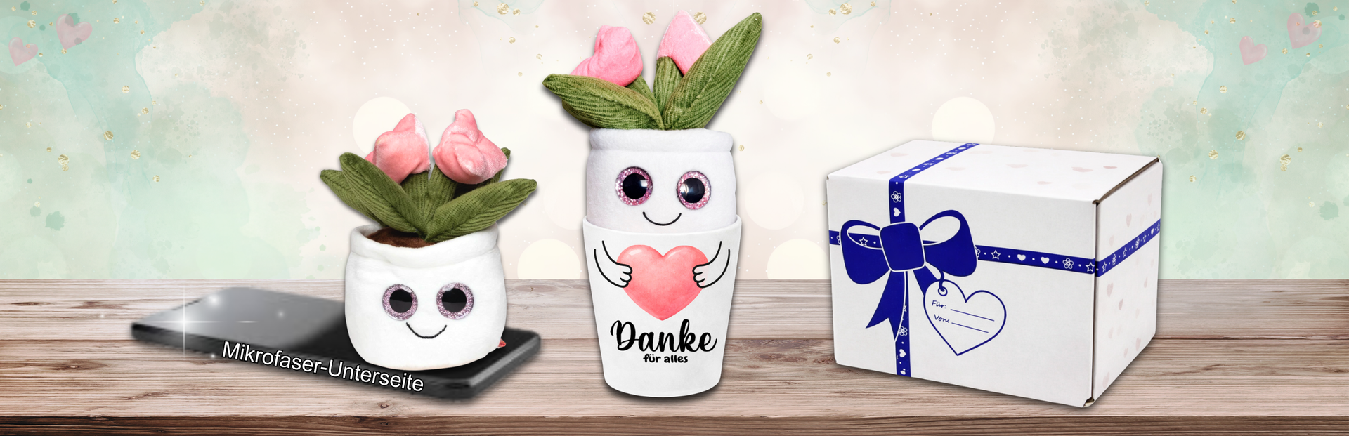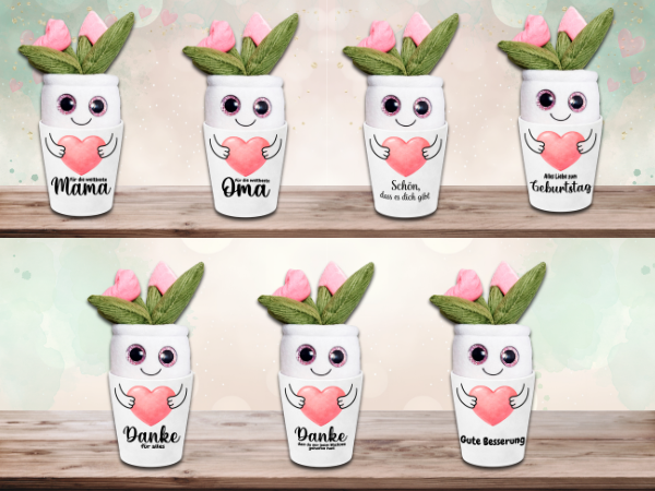 Den Blumentopf mit Plüschblume und verschiedenen liebevollen Sprüchen findest du hier auf Amazon